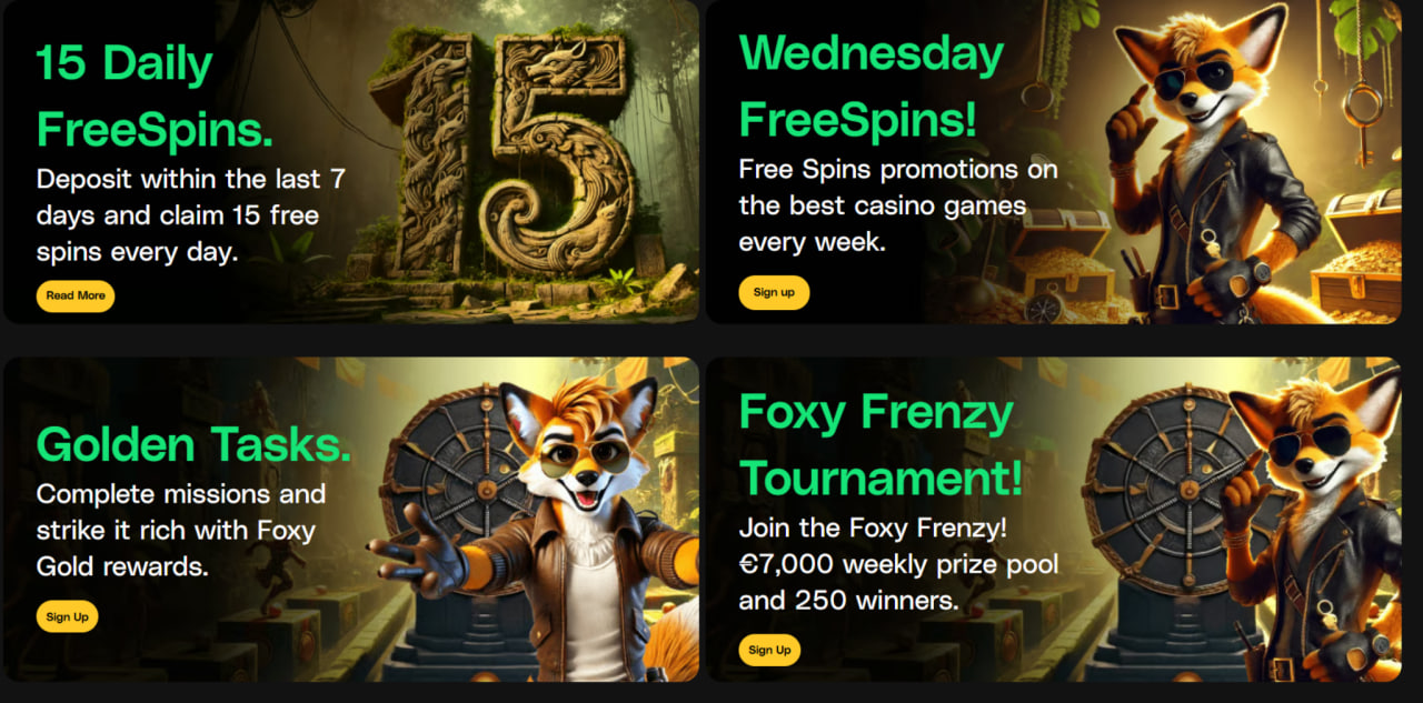 FoxyGold ondersteunt het weekritme ook met afzonderlijke promo-activiteiten, waaronder Wednesday FreeSpins. Dit format brengt dynamiek in het wekelijkse schema en maakt de bonuskalender echt levendig. Daarnaast verschijnen er op het platform regelmatig Reload Bonus-aanbiedingen en extra free spins, zodat zelfs na de welkomstfase het gevoel van voortdurende beweging en nieuwe mogelijkheden behouden blijft.